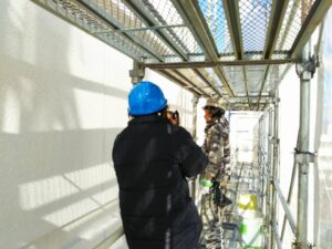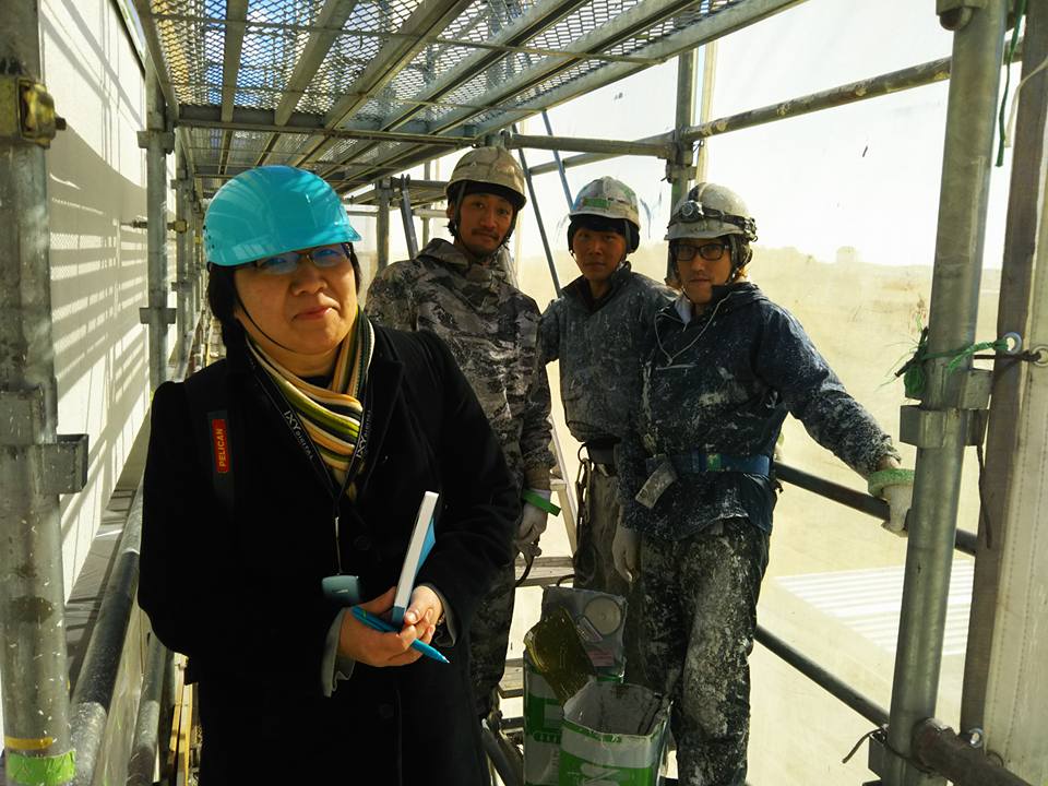 もちろん私もヘルメット着用で足場を登り、地上5~6階の現場へ。1月末だったので風邪が強くて寒かった。でも職人さん達の丁寧な仕事を間近で見ることができ、感動しました。