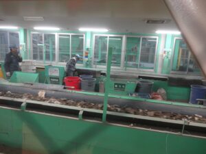 右の写真は手作業による分別。大変な作業だなー、と思って見ていたら、たまにこの作業の応援に入るという小堀さんは「コンベアが右から流れてくると目が回る。左側からは何故か大丈夫」とのことでした。作業中にもかかわらず、みなさん大きな声で「こんにちは!」とあいさつしてくれたのも印象的でした。