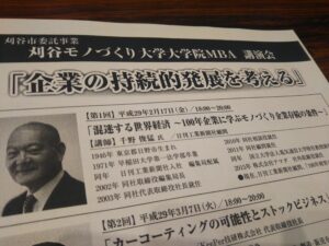 今日は刈谷モノづくり大学の講演会「100年企業に学ぶものづくり企業存続の条件」を聴講しました。講師は電気通信大学特任教授で日刊工業新聞顧問の千野俊猛氏です。