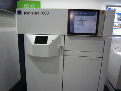 ドイツの工作機械・レーザー加工機メーカー「トルンプ株式会社」のブースでは、3D積層造形装置「TruPrint1000」の加工実演が目を引いていました。この装置では、金属のパウダーを一層ずつレーザーで焼結していくことで、1辺100mm以内の立体造形物を製造します。3D積層造形では機械加工では不可能な入り組んだ形状を実現できるのが特徴です。現在のところ精度は0.2mm程度。まずは歯のかぶせ物での実用化が期待されているとのことです。