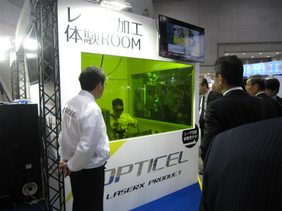 澁谷工業ブースでは、レーザーアブレーションの実演を拝見しました。レーザーアブレーションは、レーザーで金属を蒸発させて蒸着等の加工を行う技術です。同社はこれを短パルスレーザ+ガルバノスキャナの組み合わせで、特殊素材に熱影響の少ない加工を実現しました。実演では厚さ25ミクロンのポリイミドフィルムのダレのない切断加工を行っていました。