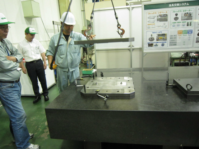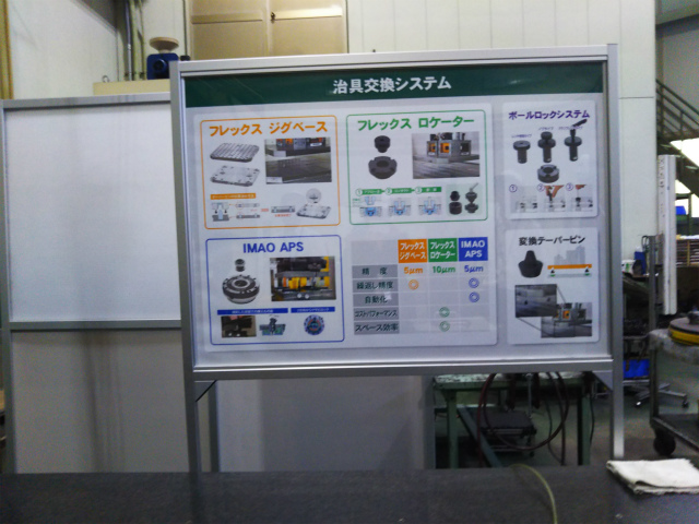 そしてこの冶具交換システムの仕様上の繰り返し位置決め精度は、±5ミクロン。今回のデモで実際に測ってもらったら、1ミクロンの精度で繰り返し位置決めできていました。冶具のコストダウン、段取り替えの時間短縮に大きく役立ちそうです。