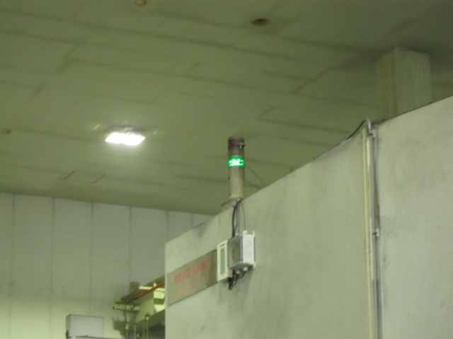 今回まず注目したのは設備の稼働状況を確認し、生産阻害の要因を特定して改善するシステム「ファクトリーステーション 機械設備監視システム」です。写真がブレてしまいましたが、シグナルタワーにセンサーがついているのがわかるでしょうか? このセンサーがシグナルタワーの運転状況(生産中または異常発生)を拾って、次に出てくる無線シグナルスイッチでデータを送信、設備の稼働状況を集中管理しています。