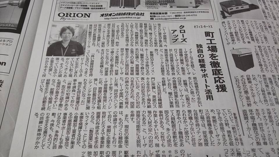溶接の業界新聞「溶接ニュース 7月18日号」で、オフィス・キートスの記事を掲載していただくことができました。思ったよりも扱いが大きくてびっくりしております。ありがとうございます!