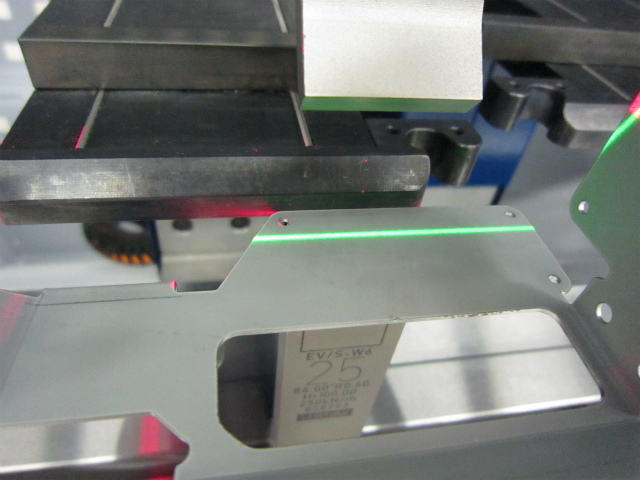 手元では、これから曲がる部分に緑色の線が見えます。奥側の黒っぽい金属部分にワークを突き当てて、加工前の位置決めをします。