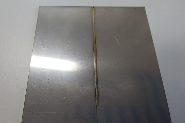 これが完成品です。CW発振(レーザ光の連続照射)によるなめらかなビード(溶接跡)ができています。溶接強度・溶け込み深さも十分な様子。トルンプ製レーザ加工機がある企業なら、仮付けや薄板溶接にいろいろ使えそうです。
