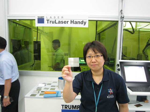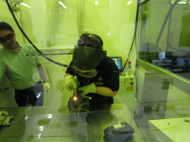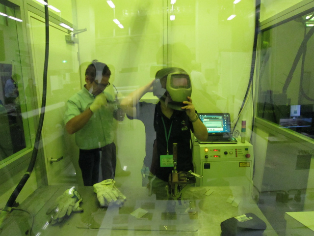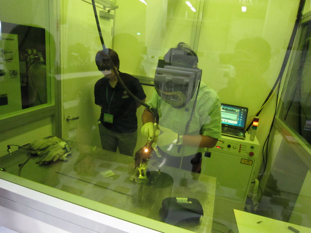 緑色もレーザ遮光パネルで囲まれたレーザ溶接専用ブースでのチャレンジです。まずはオペレータのデモを見せていただき、説明を聞いて……。