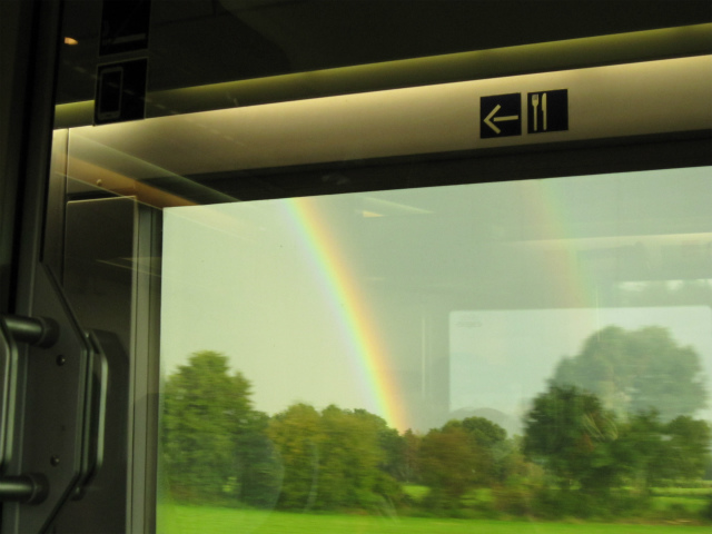 次回より、会場内の様子を少しずつアップしていきます。今日の最後は、帰りの電車の車窓から見えた虹の写真を。ダブルレインボーですね。