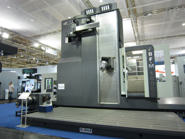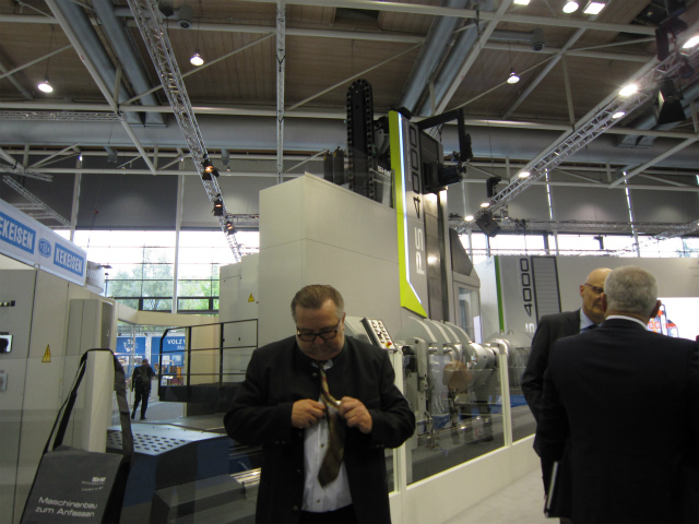 次にシュトゥットガルト近郊にある工作機械メーカーSHV社の大型マシニングセンター。写真の真ん中にオジサンが入ってしまいましたが、逆に大きさが伝わりますでしょうか? 高さ5m以上あるこの設備がSHVのラインアップの中ではミドルサイズ。大きいものは高さ8m、最大加工長さ10M以上とのことで、担当の方は会場に入らなかったことを残念がっておられました。風力発電の部品や船のシャフトなど、大型部品の加工に使われているそうです。