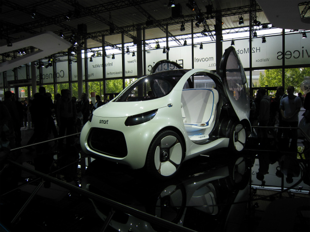 スマートはこんなかわいいコンセプト電気自動車を展示していました。自動運転を意識しているのか従来型のステアリングコラムはなく、近未来な感じを受けました。