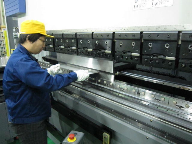 11月某日、愛知県犬山市にある村田機械さんに機械の見学にお邪魔しまして、プレスブレーキでの加工を体験させてもらうことができました。今回の機種は、プレスブレーキBH25030。加圧能力250トン、長さ3mまでの金属の板を曲げることができます。