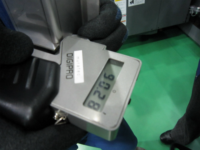 この機種には角度センサーがついていて90度に曲げられるということなので、さっそくデジタル角度ゲージを借りて測ってみました。そしたら一発で90.28度。私はプレスブレーキの操作が2度目というド素人ですが、1回目から±0.3度以内という精度内にバッチリ収まりました!