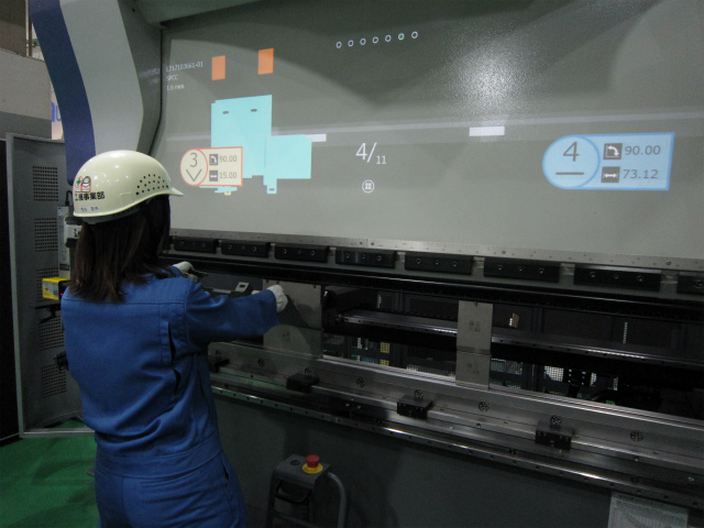 もう1台、装置の上に加工順が投影されるオプションも見せてもらいました。こちらは村田機械さんの新人女子エンジニアが加工実演してくれました。