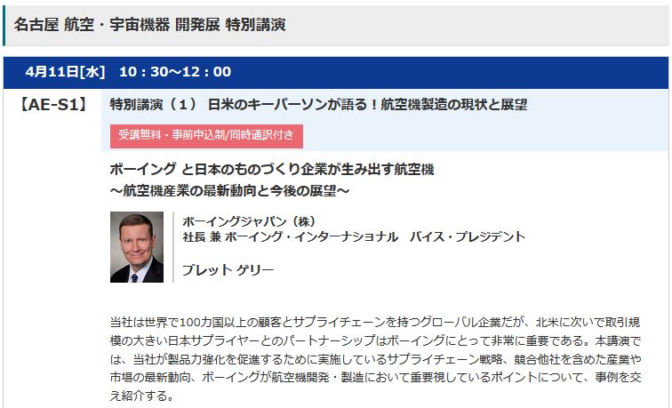 2018年4月11日は、ポートメッセ名古屋で開催された「名古屋 ものづくりワールド2018」の展示会に参加してきました。ここで名古屋航空・宇宙開発展の特別講演として、ボーイングジャパン株式会社の社長 ブレット・ゲリー氏による講演「ボーイングと日本のものづくり企業が生み出す航空機 ~航空機産業の最新動向と今後の展望~」という貴重なお話を聴くことができました。この講演、なんと聴講者が2000名で、主催者側も想定以上の人気とのこと。航空宇宙産業への関心の高さがうかがい知れます。