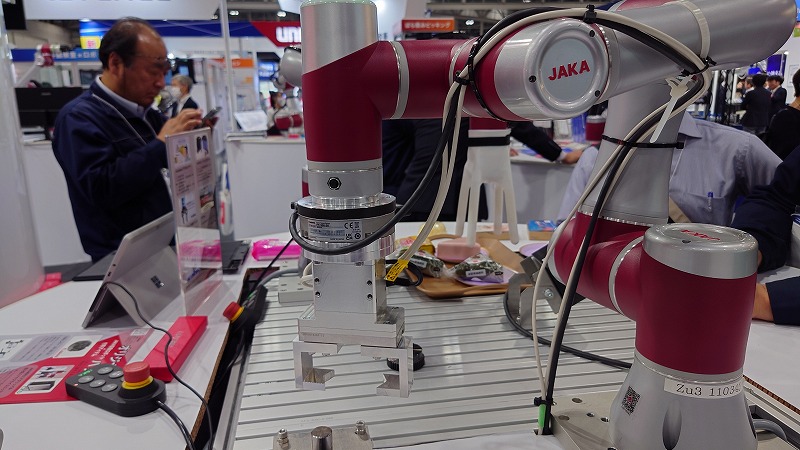 名古屋の機械商社進和さんのブースにあった、こちらの展示も気になりました。中国製の協働ロボットとの組合せで高精度を実現するCANON製「力覚センサー」(写真中央)。「精度モノには使えない」という協働ロボットの欠点を、ハンドの根元に取り付ける軽量小型の力覚センサーでカバーし、高精度を実現するというものです。