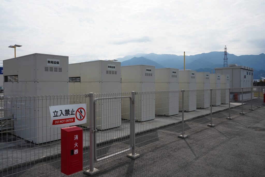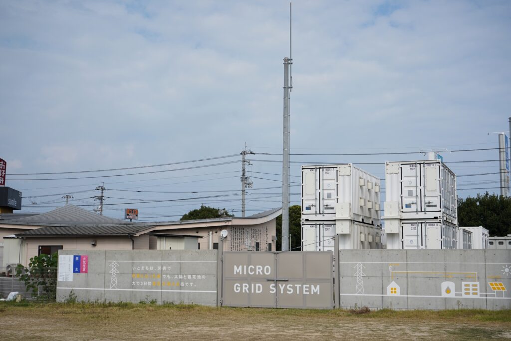 また、「いとまち」は災害で停電になっても太陽光発電と蓄電池で3日間電気がまかなえるようになっています。こちらが敷地内にあったマイクログリッドシステムの蓄電池エリアと、自家発電設備です。どちらも目立たない場所にありました。