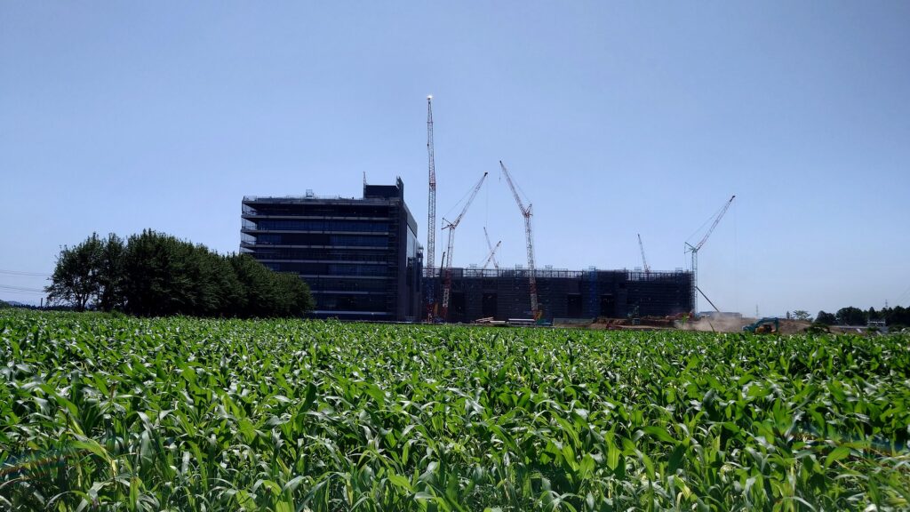 5月も同じく、国道57号線を阿蘇方面に走りました。既に外壁ができている建屋もある様子。再び近寄って見ると、既に外壁までできているようです。工場の周りはトウモロコシ畑の緑が鮮やかでした。