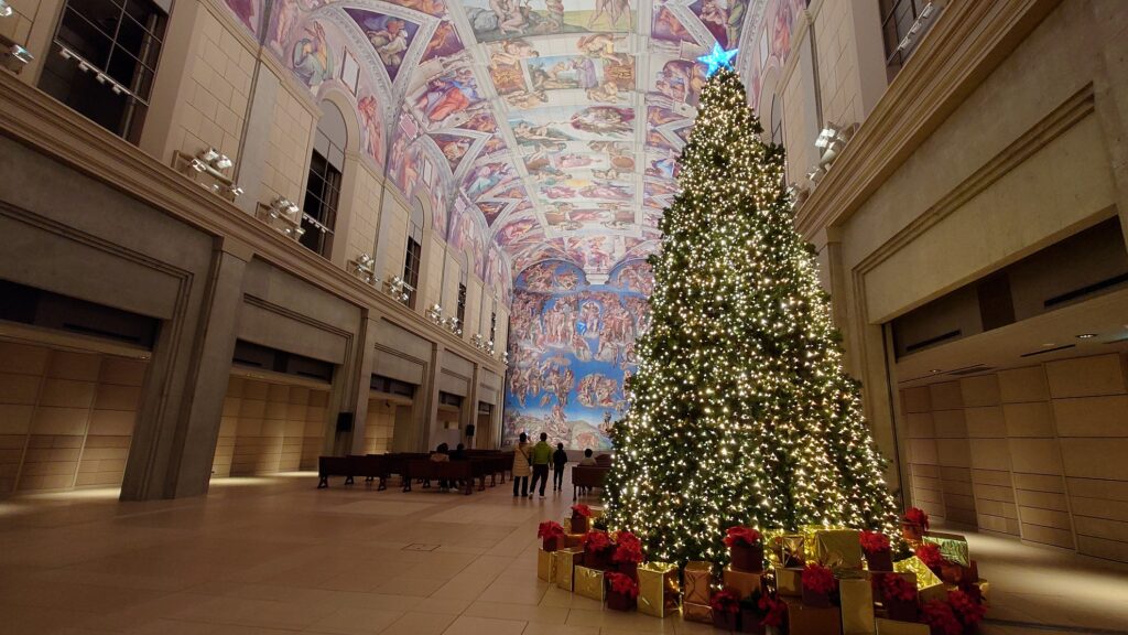 世界中を回ってもなかなか見られない名画をの数々を、複製とはいえ一度に見られるということで、本業のものづくりとは少し離れますが見学してまいりました。ちょうどクリスマスのタイミングだったので、エントランスホール横にあるシスティーナ・ホールには素敵なクリスマスツリーが飾られていました。