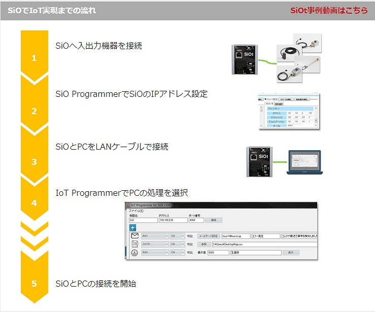 - SiOtは、SiOにEthernet通信機能がついたシリーズ。無料ソフト「IoTプログラマー」との連携で、「メール送信」「ログファイル保存」「タクトタイム計測」などができる