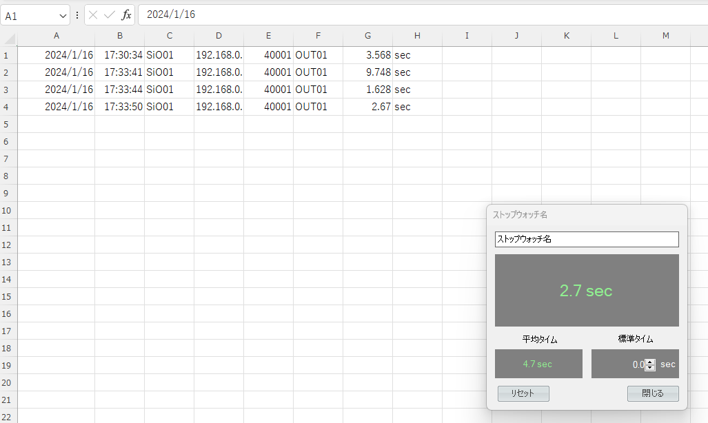 サンプルプログラム:緑ボタンでスタート、黄色ボタンでストップ の時間のログが取れる