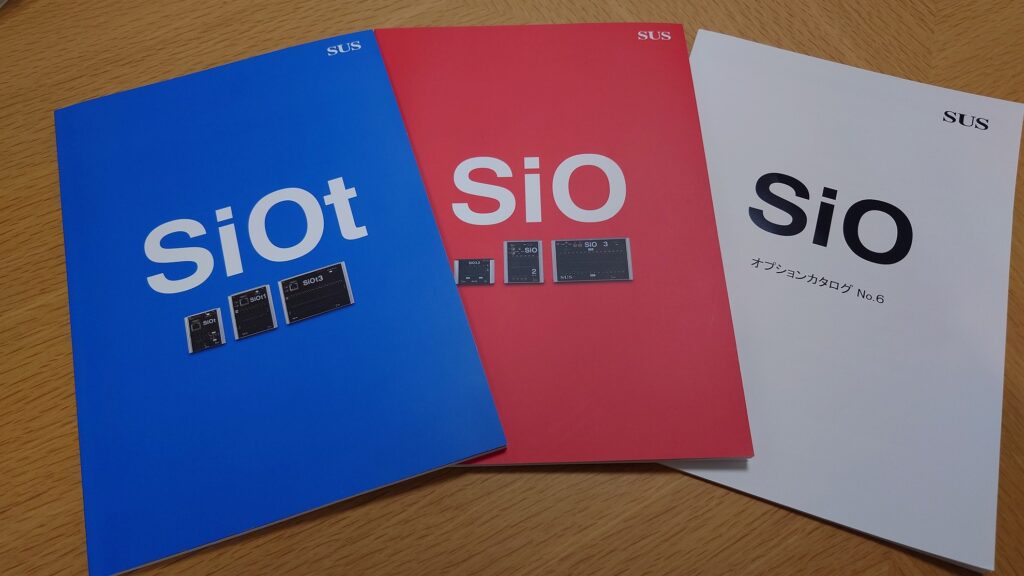 SiO(赤いカタログ)とSiOt(青いカタログ)の違いは、通信機能の有無です。白はどちらにも接続可能なオプションツールのカタログで、配線やボタン、スイッチ、センサー、エアシリンダーなどがラインアップされています。